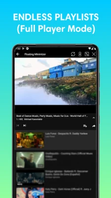 - In this mode, the app is minimized and the video on your phone or tablet is displayed in a small window in the background. So you can keep using your device while you listen to music.