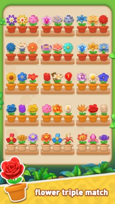 Match Three: Search for three identical flowers or objects and combine them to clear space on the board.